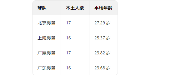 本期内容,来对比下四大豪强球队,上海男篮、北京男篮、广厦男篮、广东男篮在CBA25-26赛季中的阵容平均年龄。