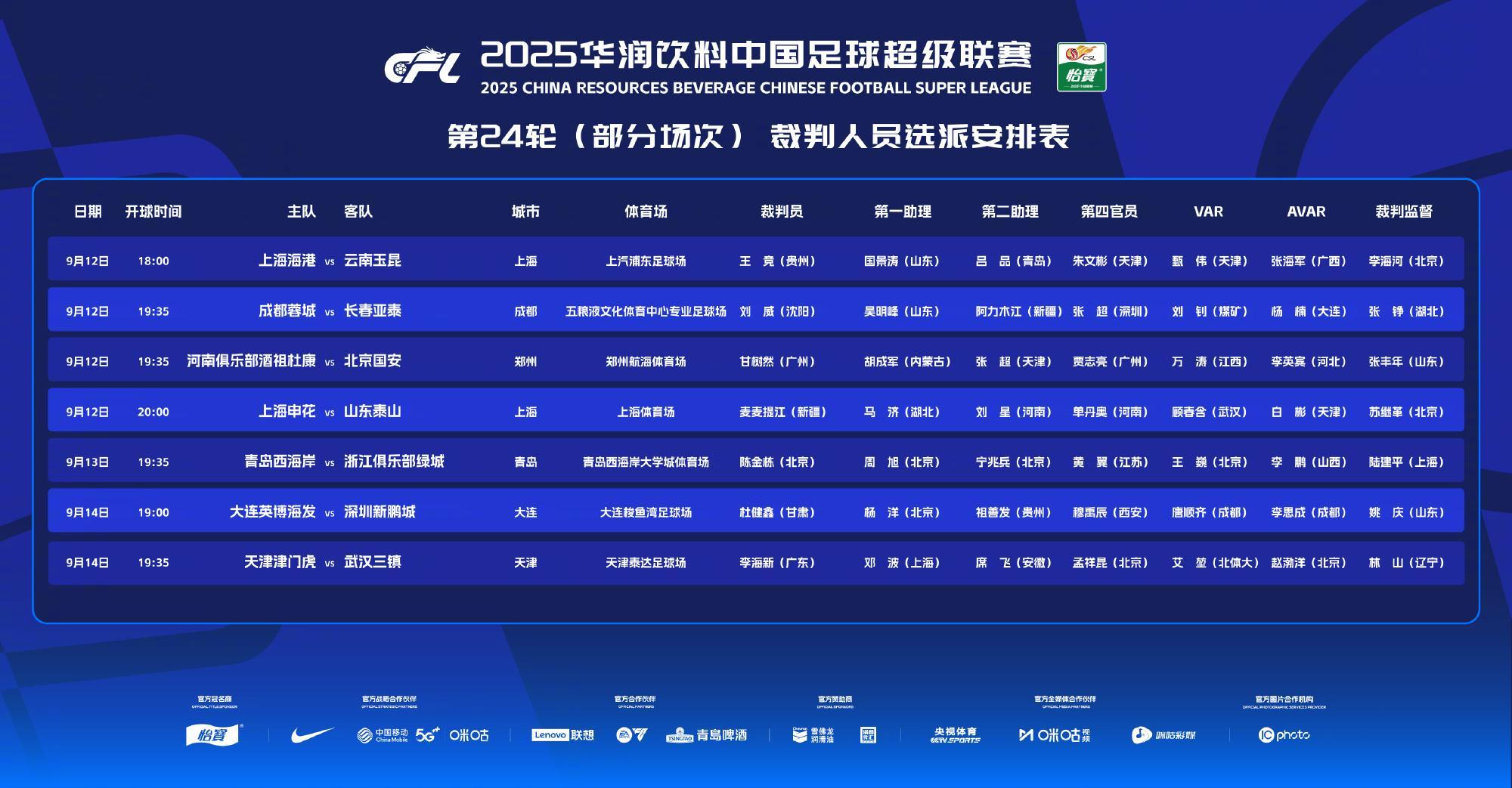 雷速体育9月12日讯 中超第24轮裁判安排表出炉,其中焦点大战申花主场对阵泰山的比赛,将由麦麦提江执法。申花vs泰山的主裁是麦麦提江,助理裁判分别为马济和刘星,VAR为顾春含。此外,此前深陷谣言的唐顺齐将担任大连英博和深圳新鹏城的VAR。...
